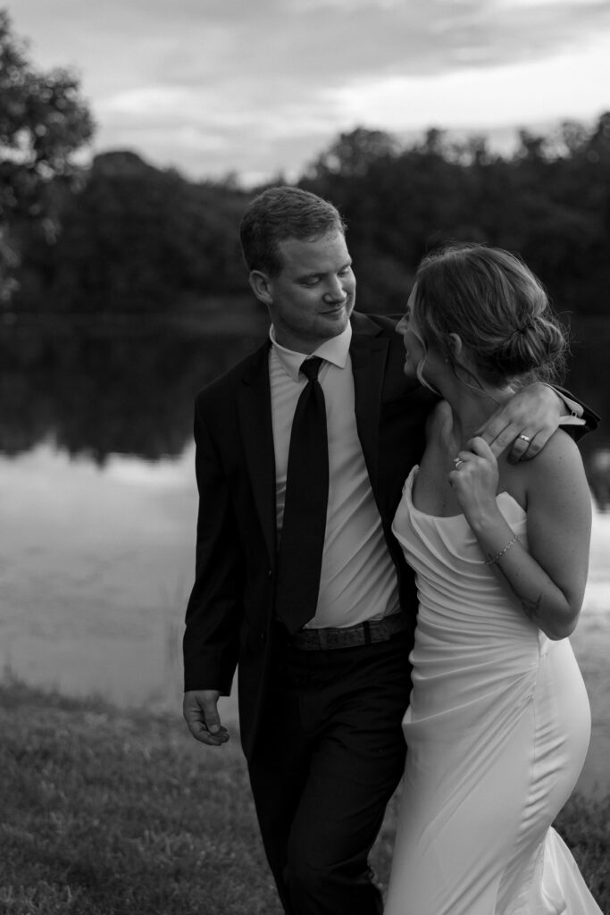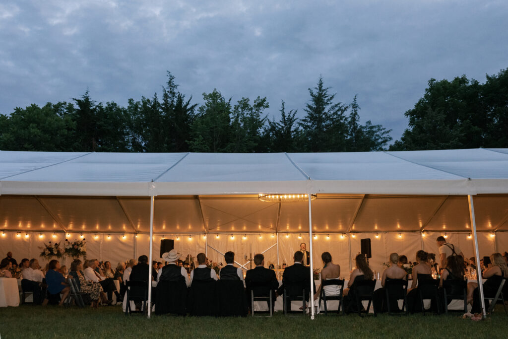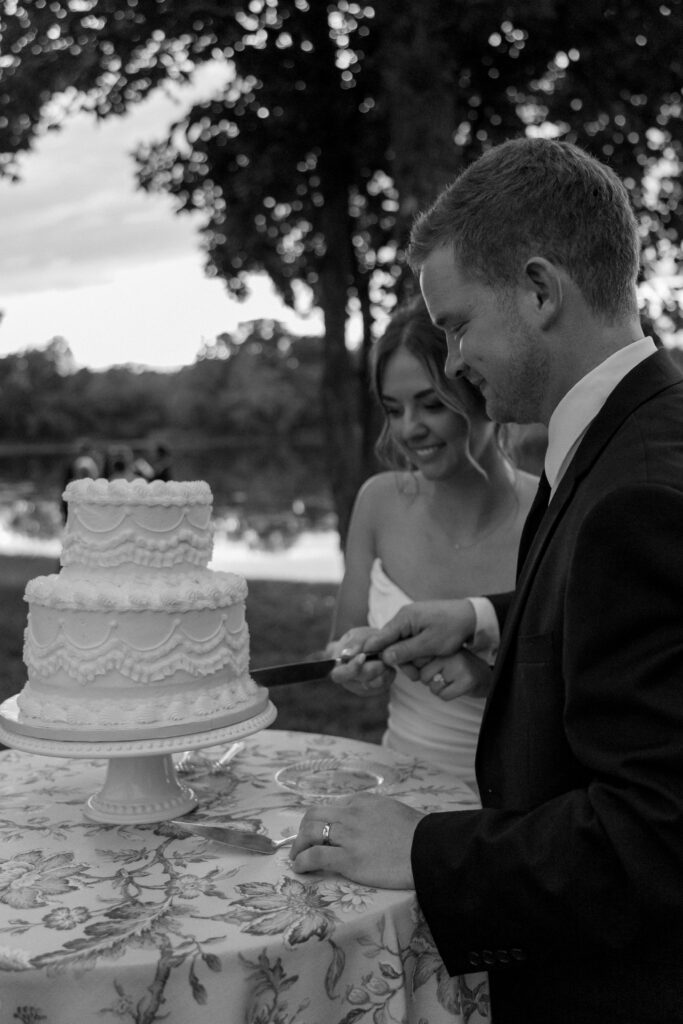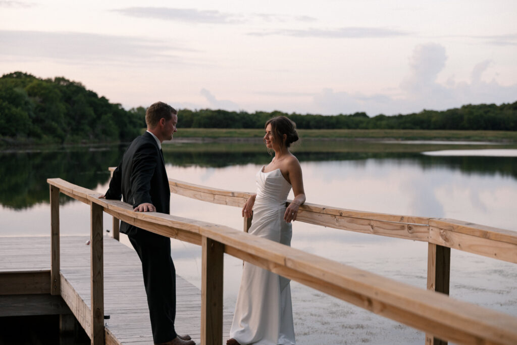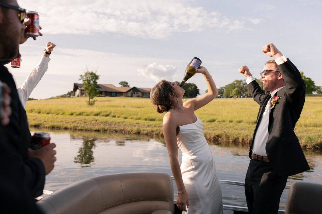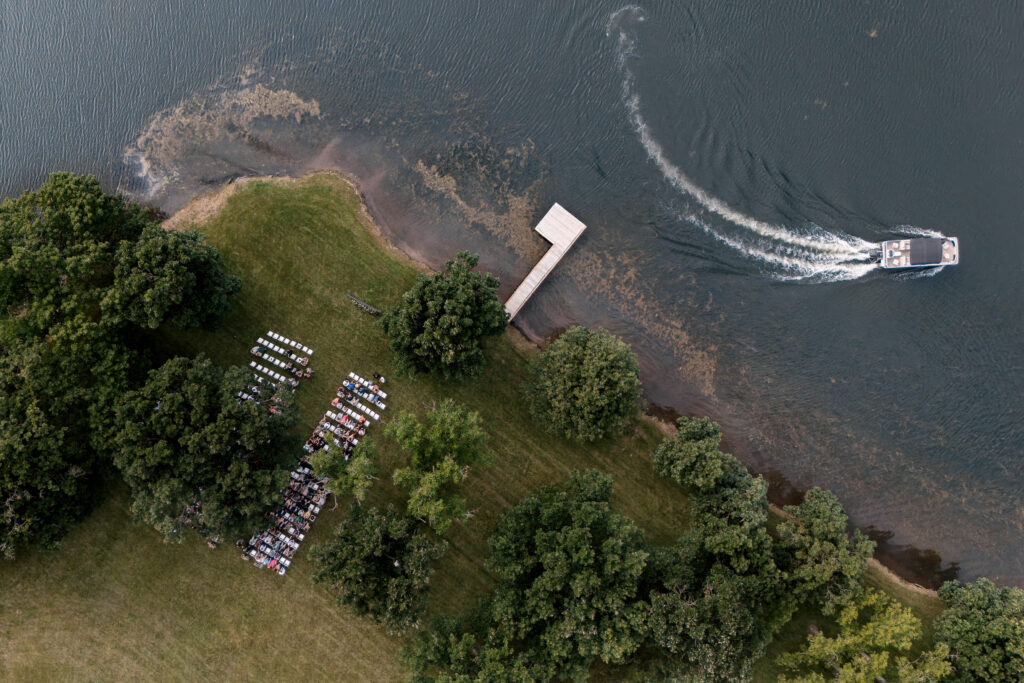 Mallory and Chandler celebrated their wedding on the most meaningful venue imaginable – Malloryβs family land – surrounded by 320 of their closest friends and family. From the moment guests arrived, they were immersed in the coupleβs thoughtful hospitality, beginning with a glass of champagne before boarding boats to cross the lake to the ceremony and reception site.