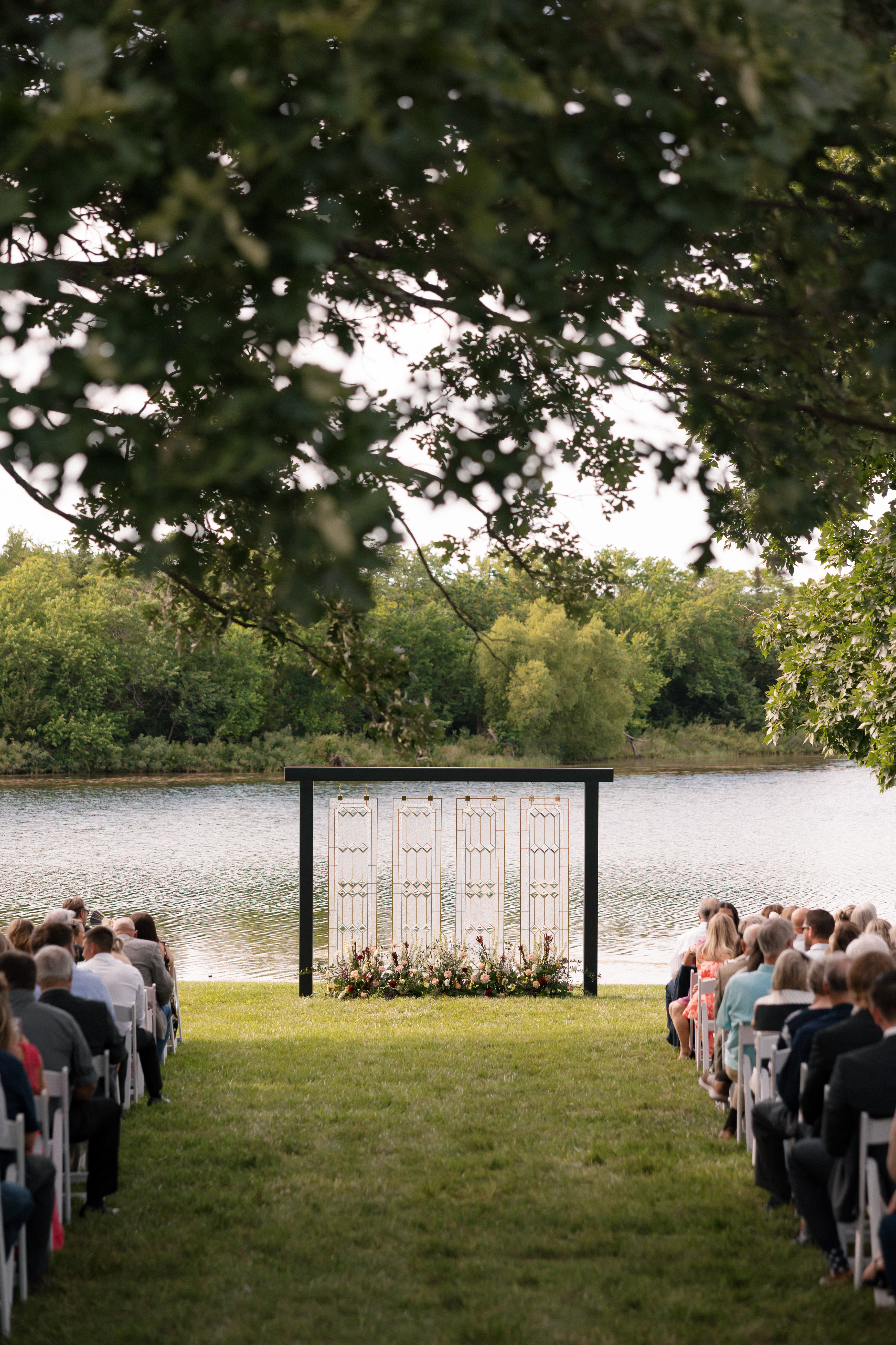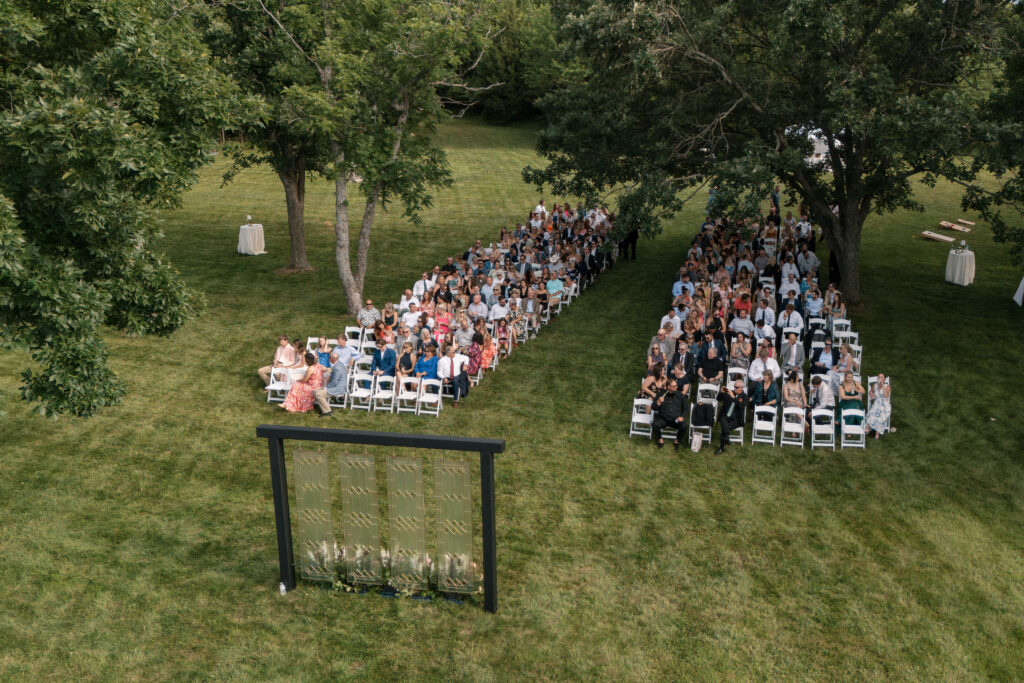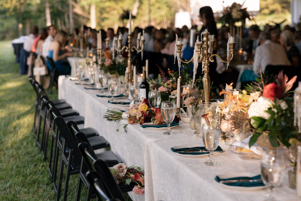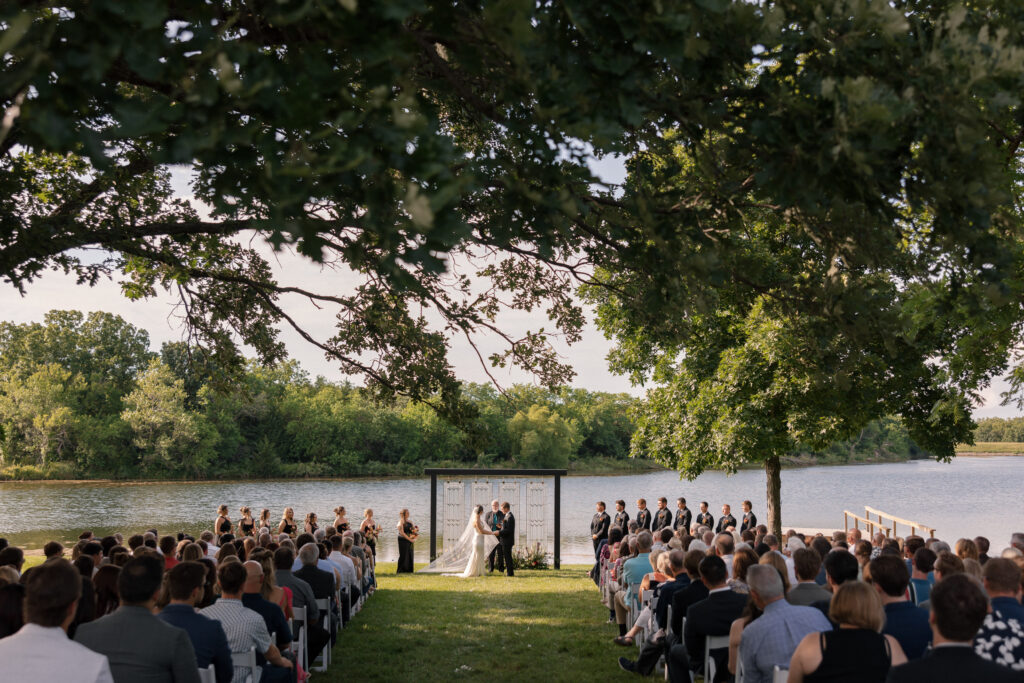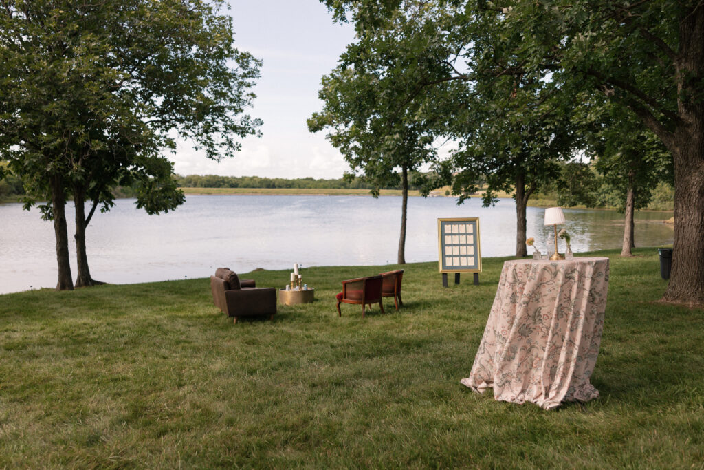When it came to the design, Mallory and Chandler wanted their celebration to feel warm, welcoming, and true to them. We blended soft, natural patterns with pops of Malloryβs favorite color – teal – bringing personality and vibrancy to the lakeside setting. The overall aesthetic was intentionally cozy and cohesive, allowing the surrounding nature to shine while creating a comfortable and inviting atmosphere.